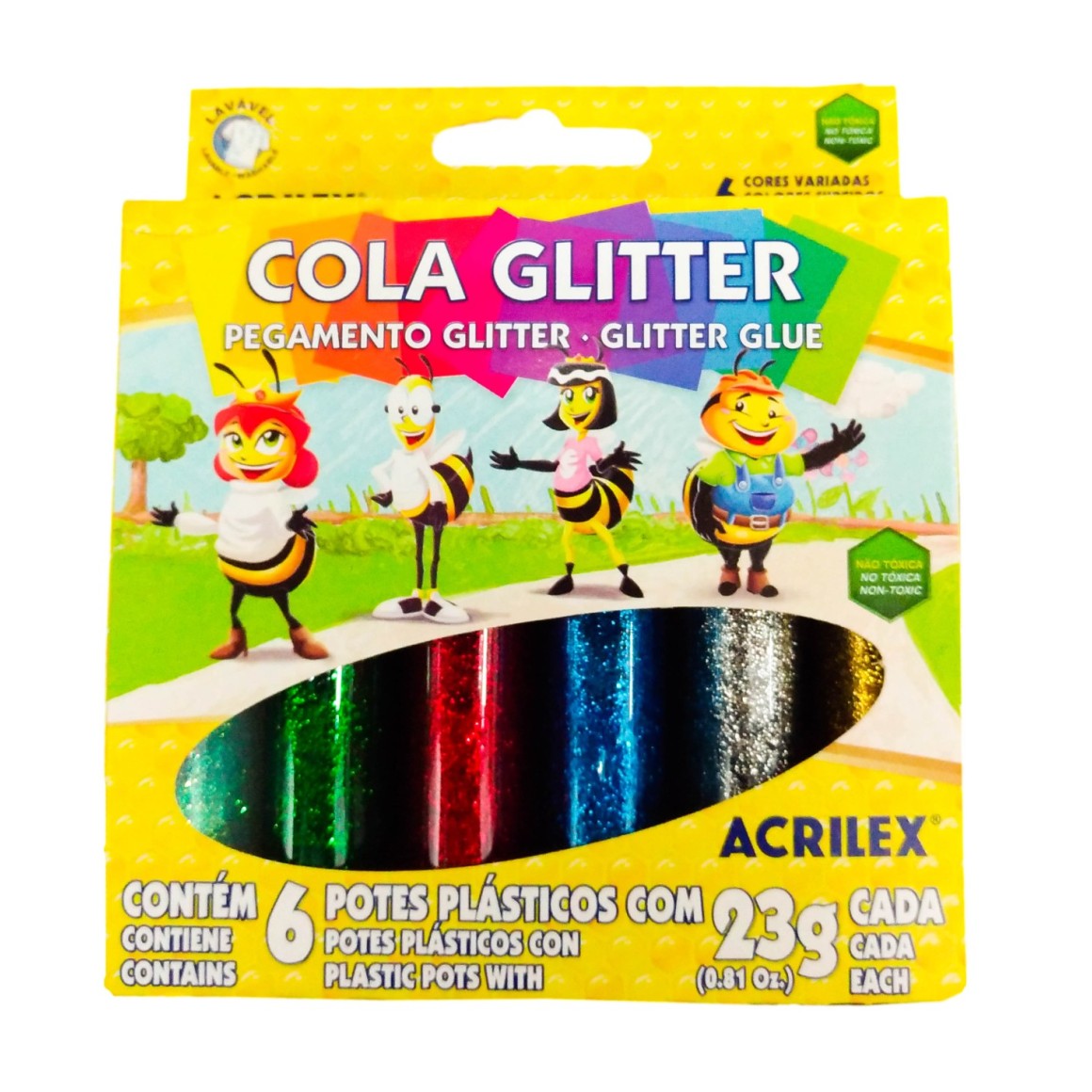 Foi desenvolvida para trabalhos escolares e artesanais. Ideal para atividades de desenvolvimento artístico. Possui um exclusivo bico aplicador que facilita a pintura, podendo ser usada também com esponja ou pincel, para fazer colagens, decorar e pintar sobre papel, papel cartão e cartolina. A Cola Glitter Acrilex não é tóxica e possui brilho intenso.