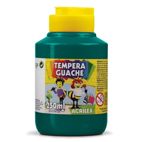 Foi desenvolvida para trabalhos artísticos e escolares. A Têmpera Guache Acrilex é um importante instrumento para o desenvolvimento da criatividade, coordenação motora e percepção visual das cores. Não é tóxica, é solúvel em água e disponível em 13 cores que são miscíveis entre si. Pode ser aplicada em papel, papel cartão, cartolina, gesso, madeira e cerâmica.